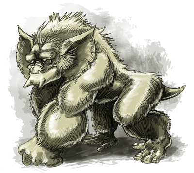 Le ganem, ou Esprit de la jungle, est un animal simiesque des Grands Arbres. C’est une véritable force de la nature qui, lorsqu’il se redresse sur ses pattes arrières atteint les deux mètres cinquante (il avoisine le mètre cinquante lorsqu’il est à quatre pattes). Malgré la présence d’une mâchoire acérée aux longues canines, le ganem est herbivore. Il raffole d’ailleurs des feuilles de jeunes pousses de Somarial.